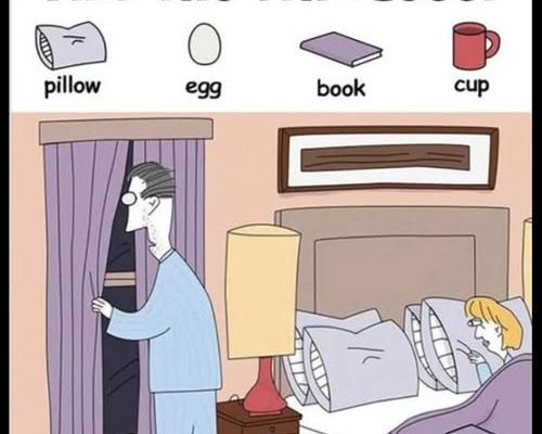 Truth is the photo hides more than meets the eye. Somewhere within the picture are four everyday items: a book, a cup, an egg, and a pillow.
